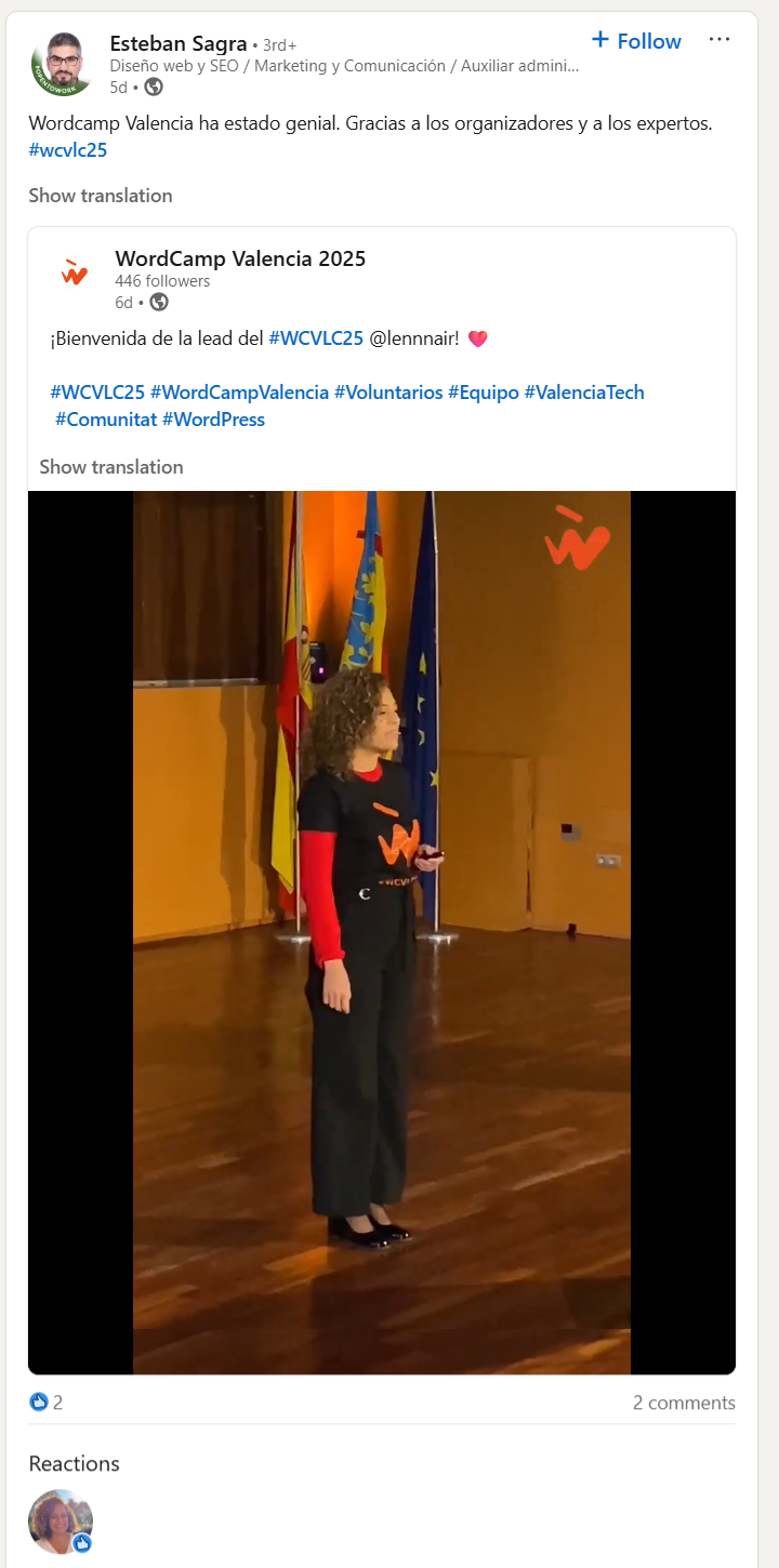 And alongside us, there was a very special figure: the mentor of WordCamp Valencia 2025. We were lucky to have Pablo Moratinos, who accompanied us, guided us, and solved key issues throughout the whole process. He has a long track record in the WordPress Community in Spain and is a benchmark for his experience and commitment. He has an impressive collaboration résumé: he has been team leader at four WordCamps, two at WordCamp Irún and two at WordCamp España Online, and co-organized four, the first being WordCamp Chiclana 2017. To date, he has mentored nine WordCamps, accompanying and supporting organizing teams with professionalism and a clear vision. He came as a mentor and a speaker.